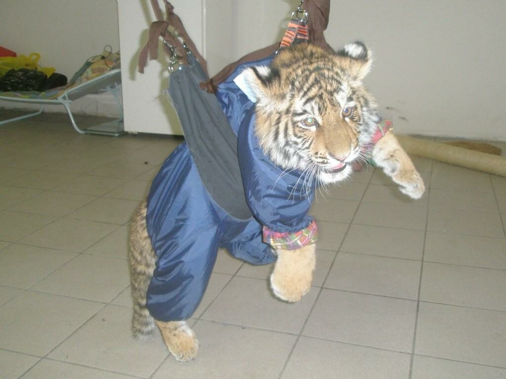 - Цезарь был совсем «никакой», когда мы его привезли на курацию к ветеринарам. У ветеринаров-то самих шок был. С первого дня появления тигрика мы начали проходить обследования-анализы, узи-рентгены и т.д., сразу же ветеринары дали однозначный вердикт: почечная и печёночная недостаточность, 13 переломов (позвоночник, таз, задние и передние конечности), неусваиваяемость кальция и другие страшные заболевания, которые просто не совместимы с жизнью. Зоопарковские сотрудники говорили, что они в своей практике таких малышей усыпляют… Но я сдаваться не хотела и решила бороться за жизнь тигрёнка. Капризов никаких не было, тигр то время был подавленный, забитый и грустный. Кушал он первое время очень плохо, кормили из бутылочки специальными смесями, иногда часами приходилось с ним сидеть, чтобы хоть чуть-чуть проглотил. Но уже через месяц лечения, курсов массажа, терапии на «вытяжке» (это когда тигр висит в специальной конструкции, чтобы косточки сращивались), Цезарь стал намного лучше себя чувствовать, улучшился аппетит, появилась игривость и большая подвижность.