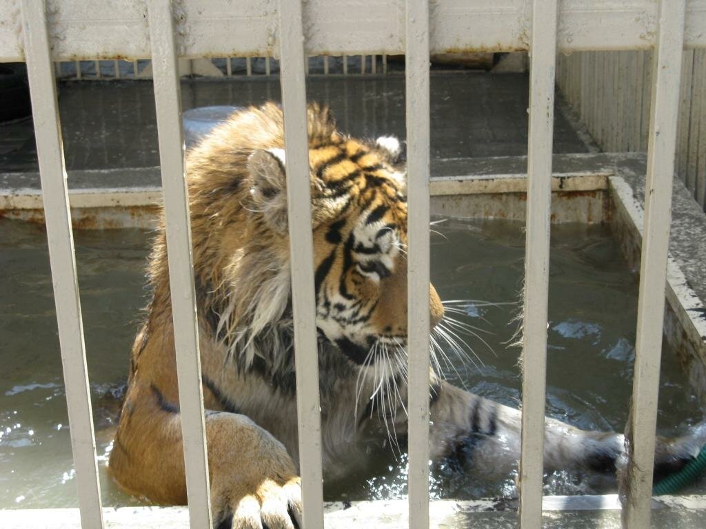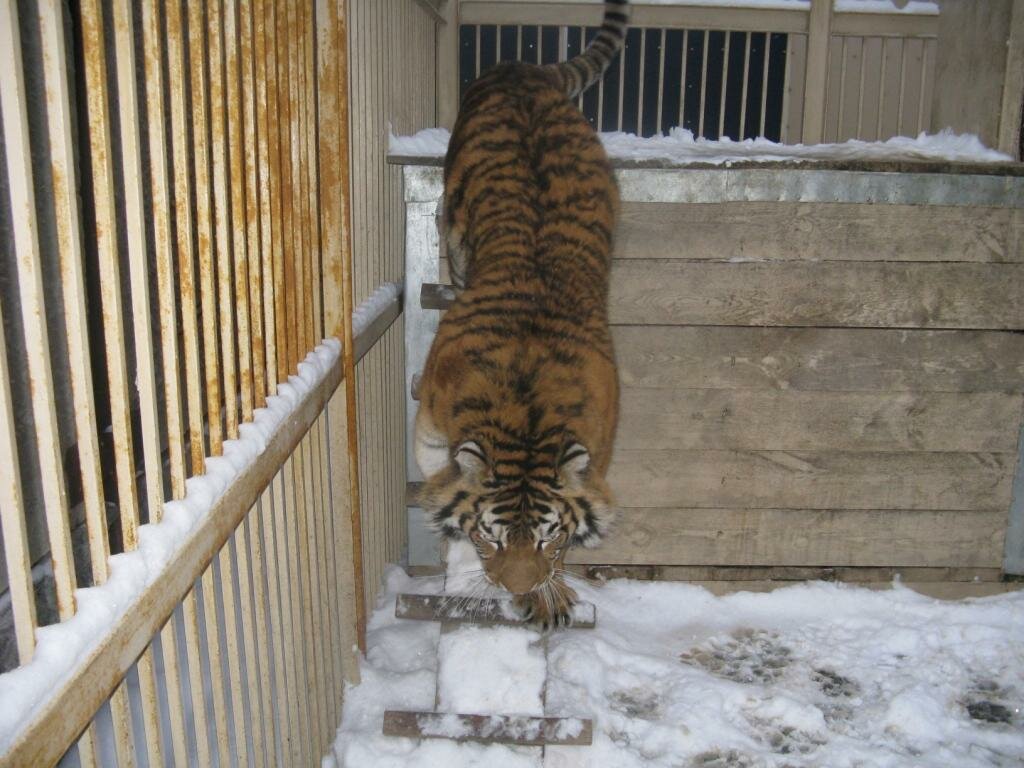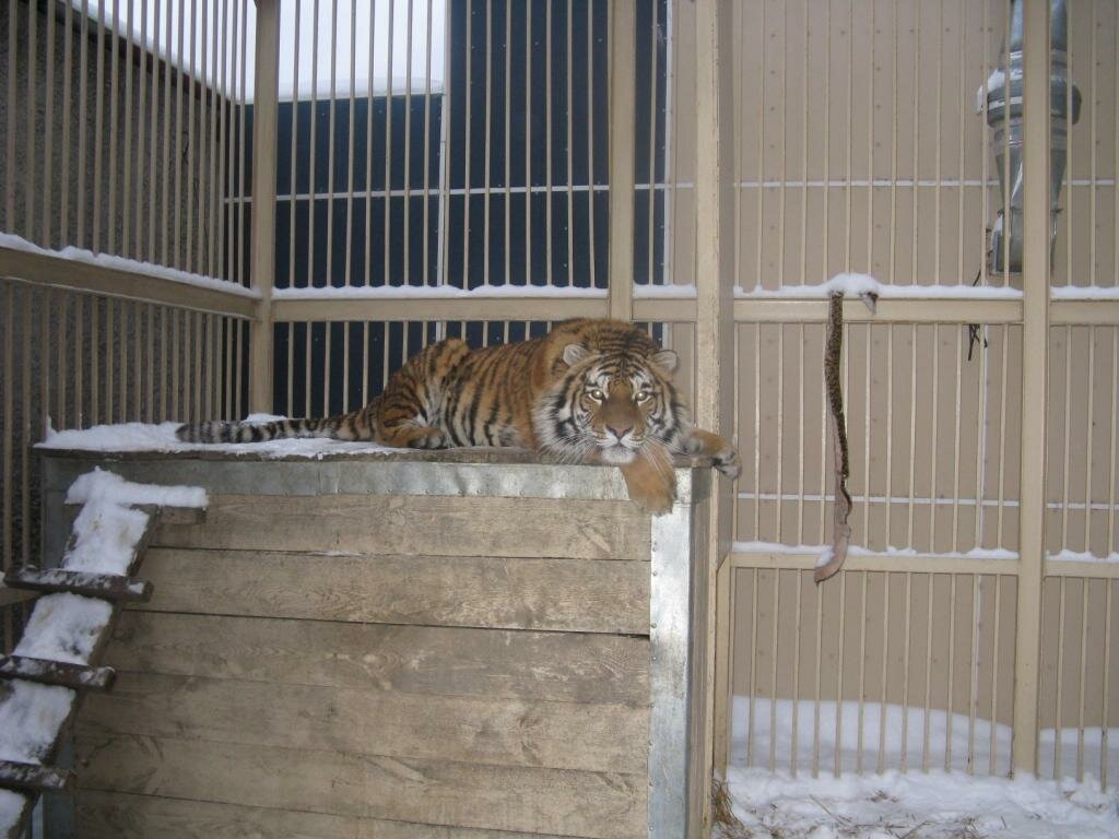 ... и к тигру не попасть никак. Уже 8 дней ... езжу и через бетонный забор перекидываю ему небольшие куски мяса, чтобы через прутья крыши клетки провалились...