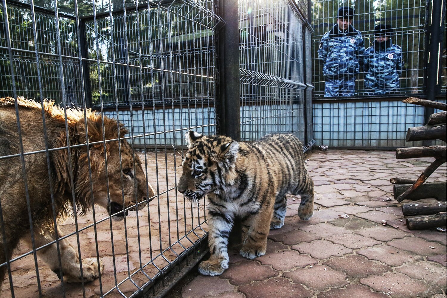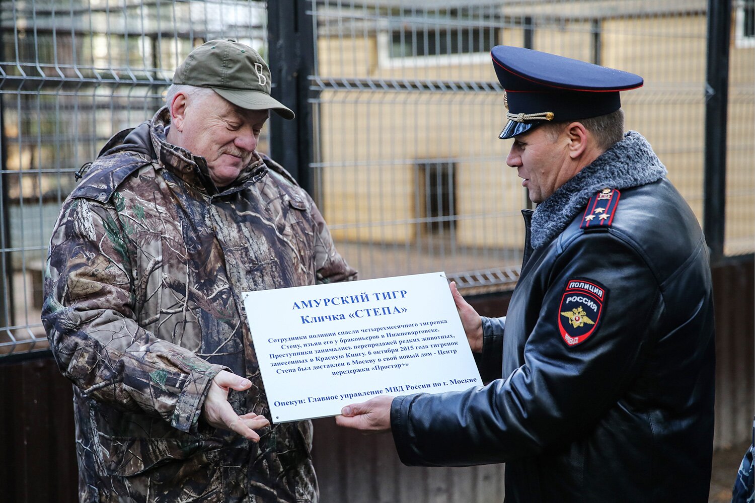 Начинается торжественная церемония. Заместитель начальника ГУ МВД России по Москве, полковник полиции Геннадий Голиков вручает бумажное подтверждение шефства, то есть табличку, директору Центра реабилитации диких животных «Простар+» Виталию Ратнеру. Табличку вешают на стенку вольера. Все любуются. Даже звери.