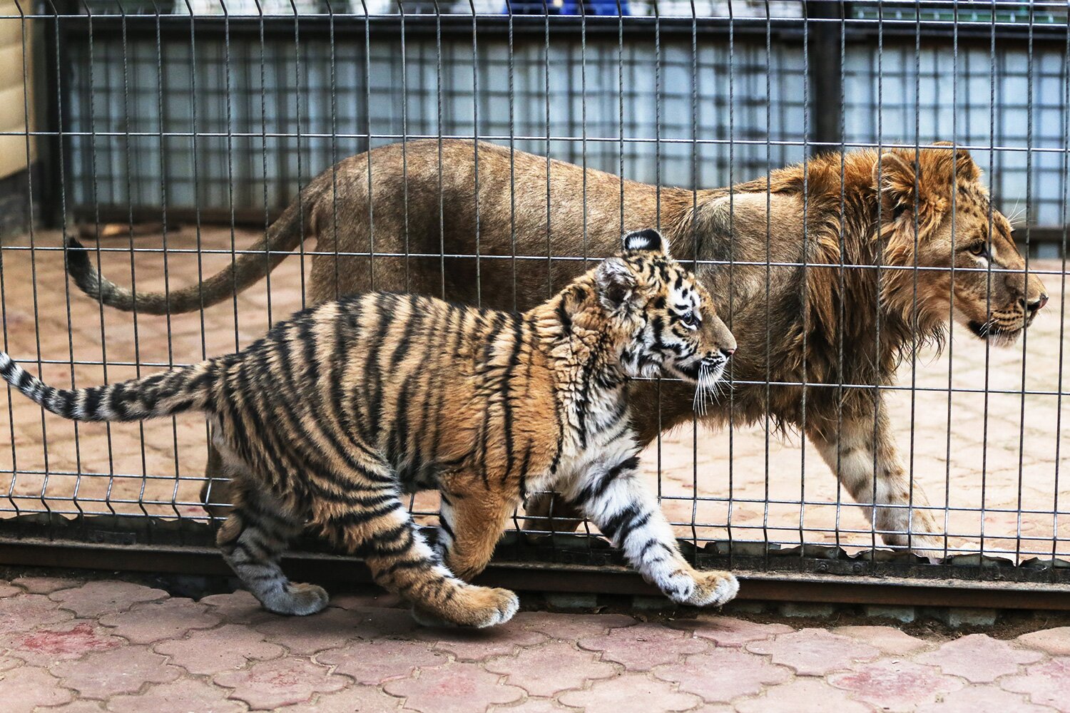 лев Бонифаций, бегая туда-сюда вдоль смежной стены, пытается то ли раззадорить тигренка, то ли перетянуть на себя внимание гостей.