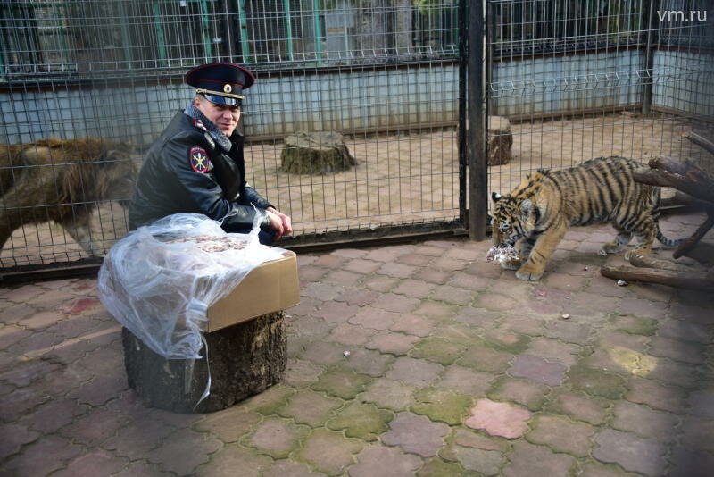 Торжественная часть закругляется – дело переходит к банкету. Своему новому подопечному столичная полиция привезла в подарок 50 килограмм мяса. Перед процессом кормежки Виталий Ратнер решил объяснить гостям схему поведения с представителем семейства кошачьих, если вы по какой-то случайности оказались не снаружи вольера, а внутри.
