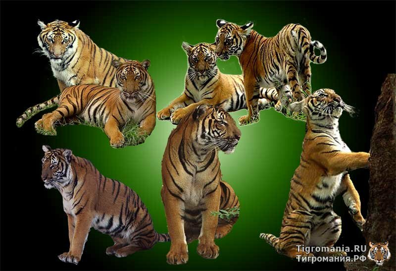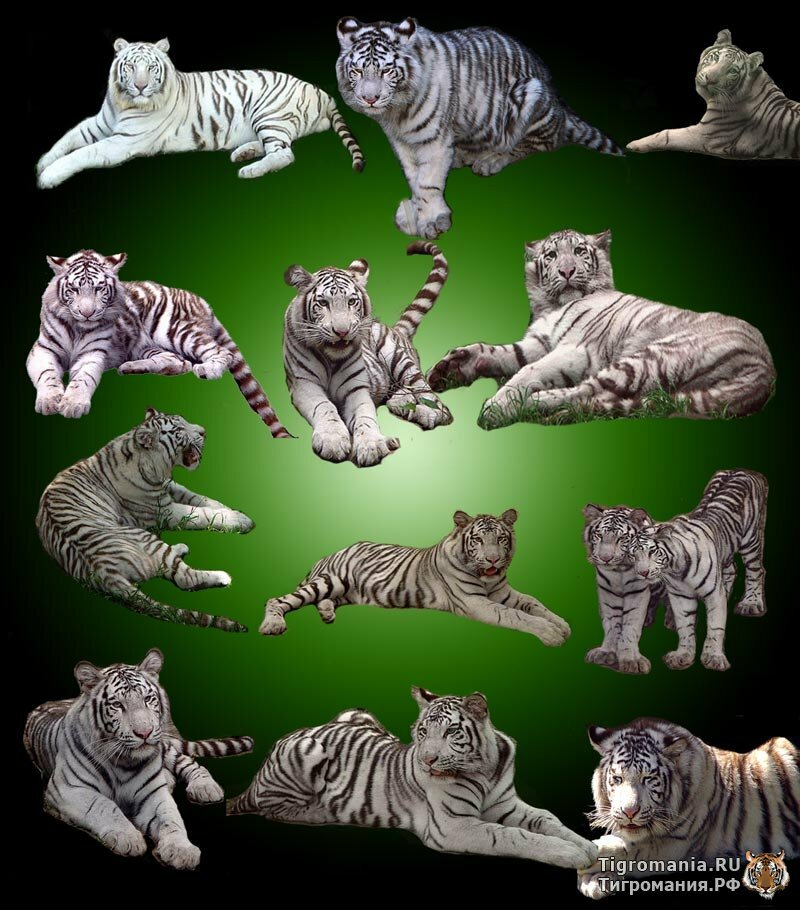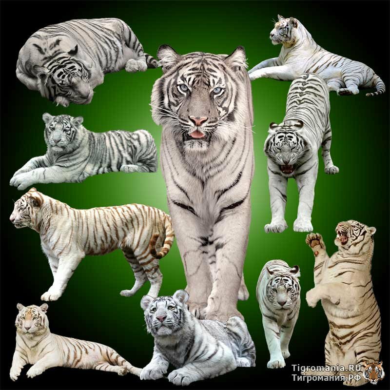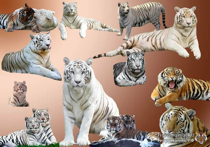 Белые тигры и рыжие тигры для ваших коллажей. Каждая картинка расположена на отдельном слое. Желаем вам успехов в вашем творчестве.