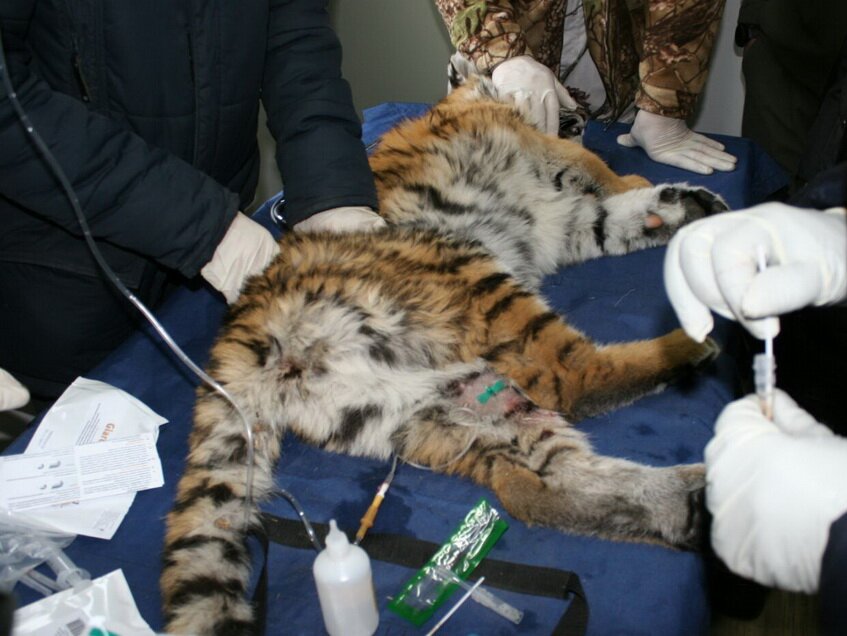 Ветеринары в воскресенье провели повторный осмотр четырехмесячного котенка амурского тигра, спасенного от собак у границ национального пара «Земля леопарда». По предварительному заключению, состояние животного значительно улучшилось, однако для полного выздоровления ему потребуется не один месяц.
