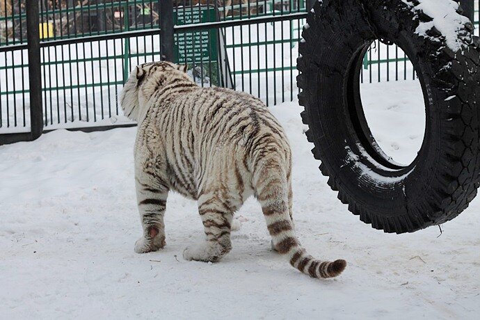В красноярском зоопарке "Роев ручей" бенгальскому тигру Хану обед подвесили на цепь.