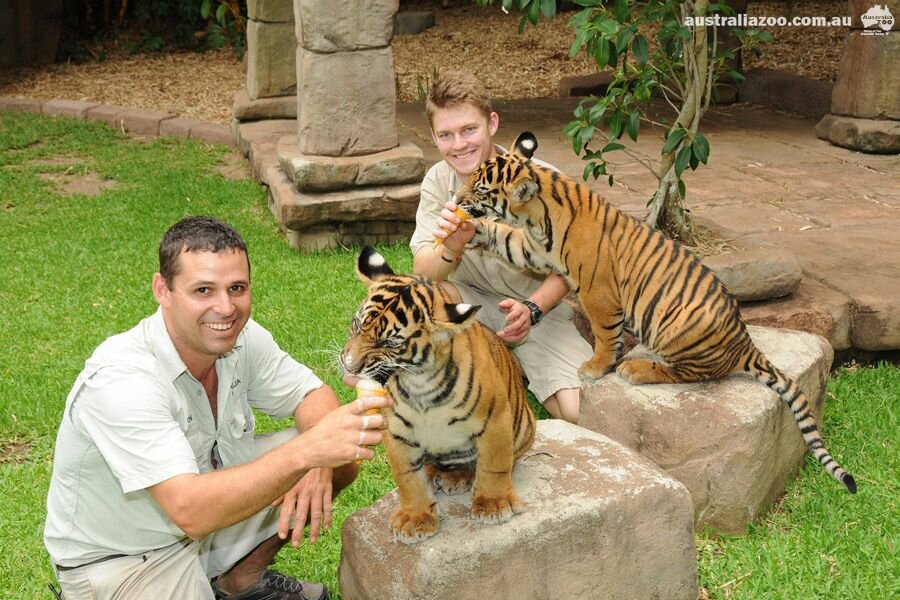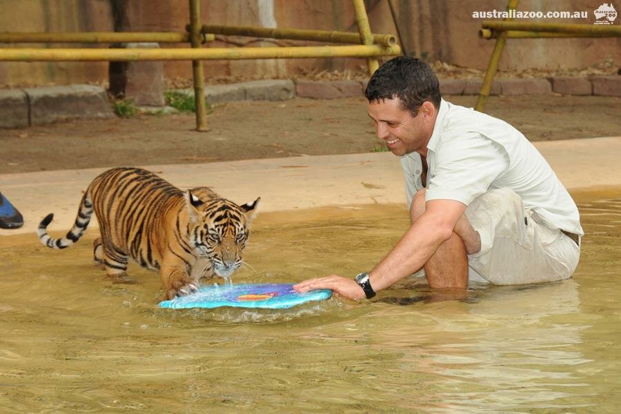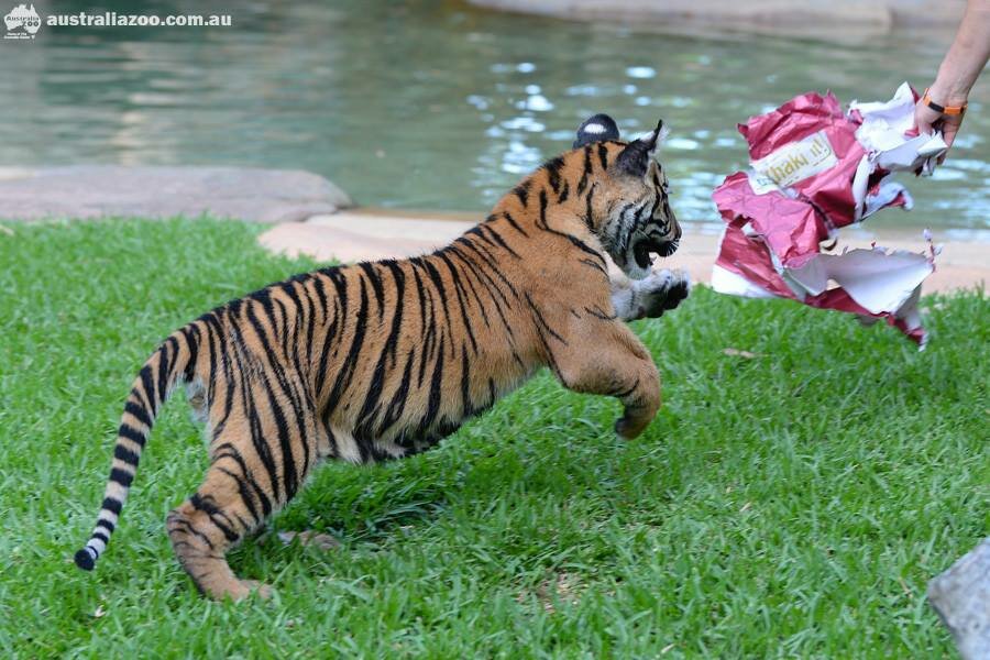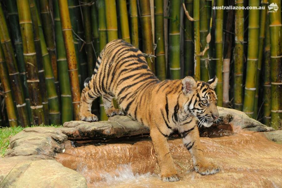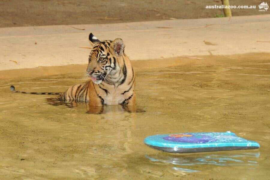 Именно так в Зоопарке Австралии спасаются от зноя любимцы всего персонала и гостей — суматранские тигрята. Мальчиков зовут Хантер и Кларенс. Вместе со своими смотрителями они целыми днями плавают в огромном бассейне на территории Тигриного Храма. Экспозиция и бассейн полосатых хищников оснащены стеклянной стеной, через которую гости зоопарка могут любоваться тиграми, плавающими как под водой, так и на поверхности!