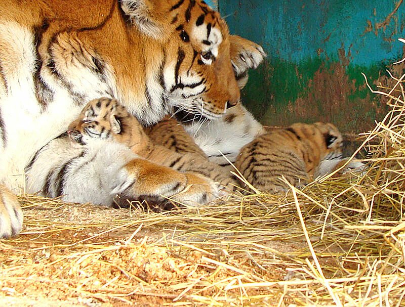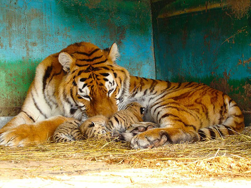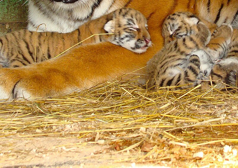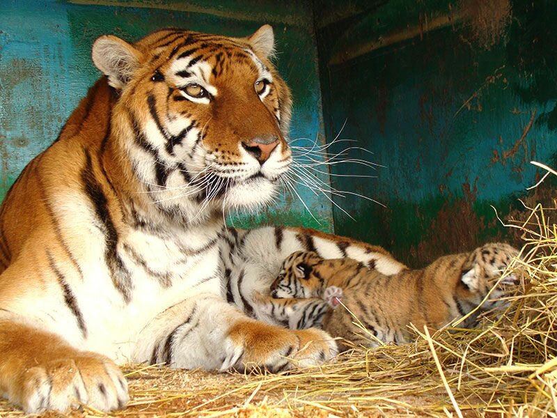 18 декабря сотрудники "Сафари" заметили, что тигрица отказывается есть, и поняли, что в ближайшее время она окотится. Поставили ей в вольер побольше молока, следили за ее состоянием, а затем увидели рядом с хищницей троих маленьких тигрят.