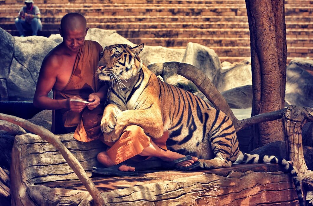 Это серия фотографий посвящена сытым и довольным тиграм монастыря Ват Па Луангта Буа Янасампанно на западе Таиланда. Одно из немногих мест на земле, где ради вареной курицы, кошачьего корма и человеческой заботы эти величественные животные готовы забыть о своих инстинктах и дают потрепать себя за ухом.