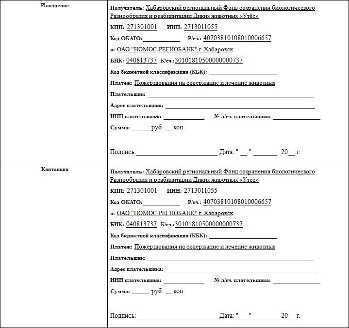 ПОЛУЧАТЕЛЬ: Хабаровский региональный Фонд сохранения биологического Разнообразия и реабилитации Диких животных "Утёс"